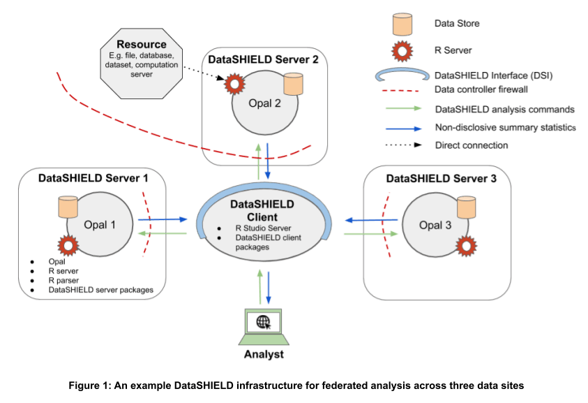 DataSHIELD is a scientifically mature, open-source data analysis platform for federated analysis with real-time disclosure control. It comprises a client-server architecture. The individual patient data remain server-side, with the data custodian and are not viewed by the analyst nor shared or moved. The role of the client-side is to issue analysis commands that are sent to each data server where they are then executed. These commands reshape data, run analyses, check outputs for disclosure and return these to the DataSHIELD client. DataSHIELD functions are designed to only output summary statistics that are typically low-dimensional, and are not directly disclosive, nor do they contain individual pateint data.